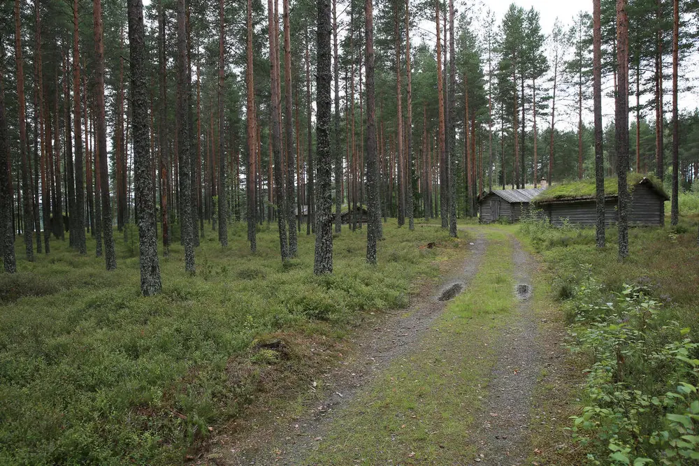 Kjørerkoie fra Bjudalen, Elverum. Stallen ved koia viser at det har bodd tømmer-kjørere der. Denne koia har peis i hjørnet innenfor døra, og karene lå ved siden av hverandre med føttene mot peisilden. Slike peiskoier var vanlige i Solør, Elverum og Sør-Trysil på 1800-tallet.